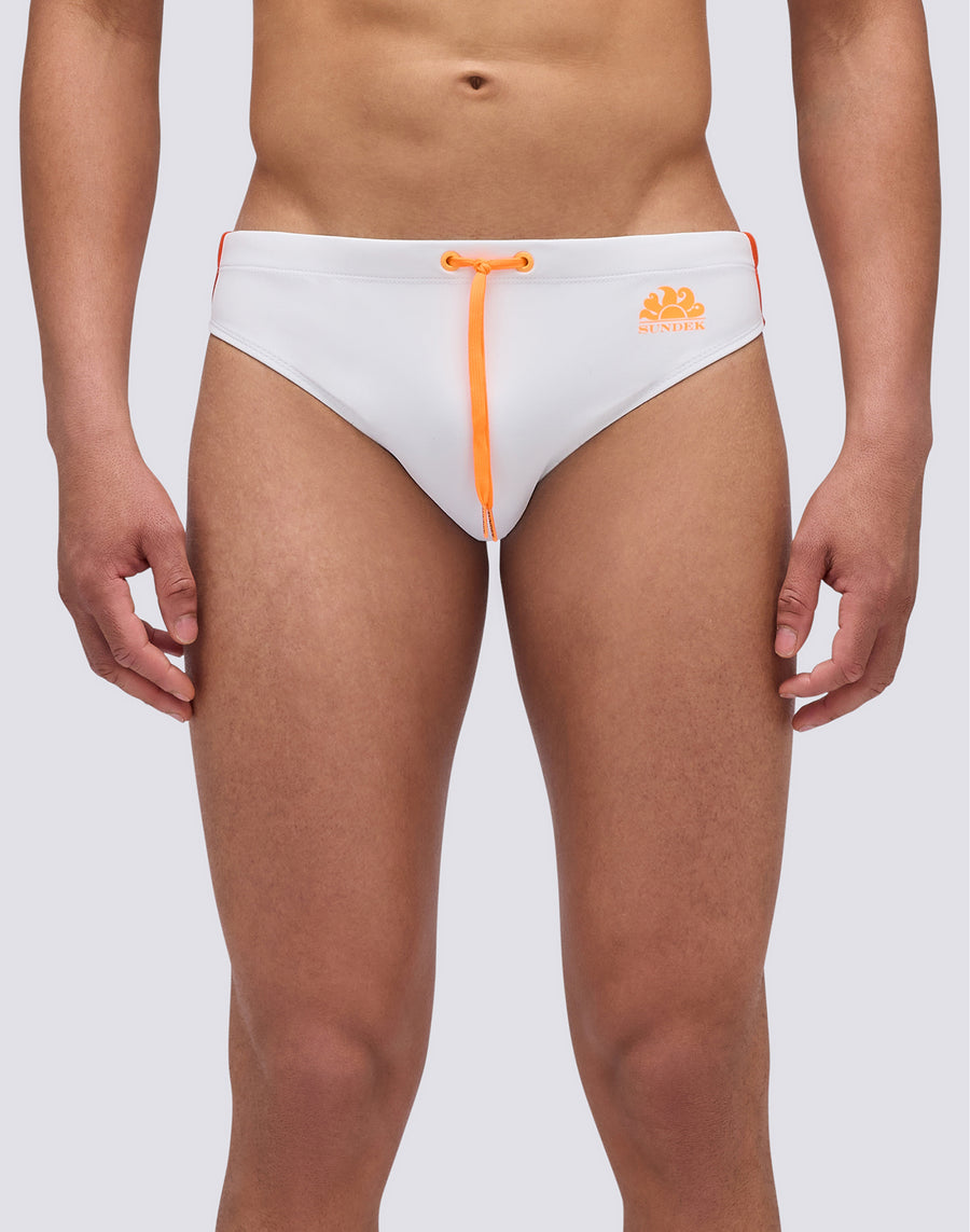 Costume slip uomo tinta unita e vita regolabile. Lo slip da mare monocromo con laccio coulisse e tre bande laterali colorate a contrasto per un look deciso e funzionale. Si asciuga velocemente e ti dà comfort e resistenza in acqua e fuori dall'acqua: indossalo per nuotare e allenarti e quando ti riposi e prendi il sole.