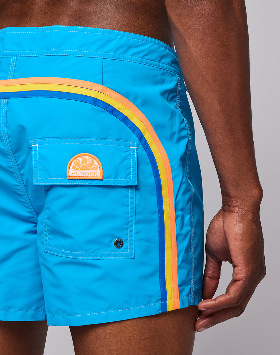Energia vibrante, colore intenso e l’iconico arcobaleno Sundek che fa capolino per questo costume boxer da uomo. E' realizzato nel nostro tessuto storico nylon taffetà, dalla mano serica confortevole e ad asciugatura rapida, mentre le cuciture a tre aghi lo rendono resistente vacanza dopo vacanza. Lunghezza 35 cm (taglia M), misurati sul lato esterno della gamba.