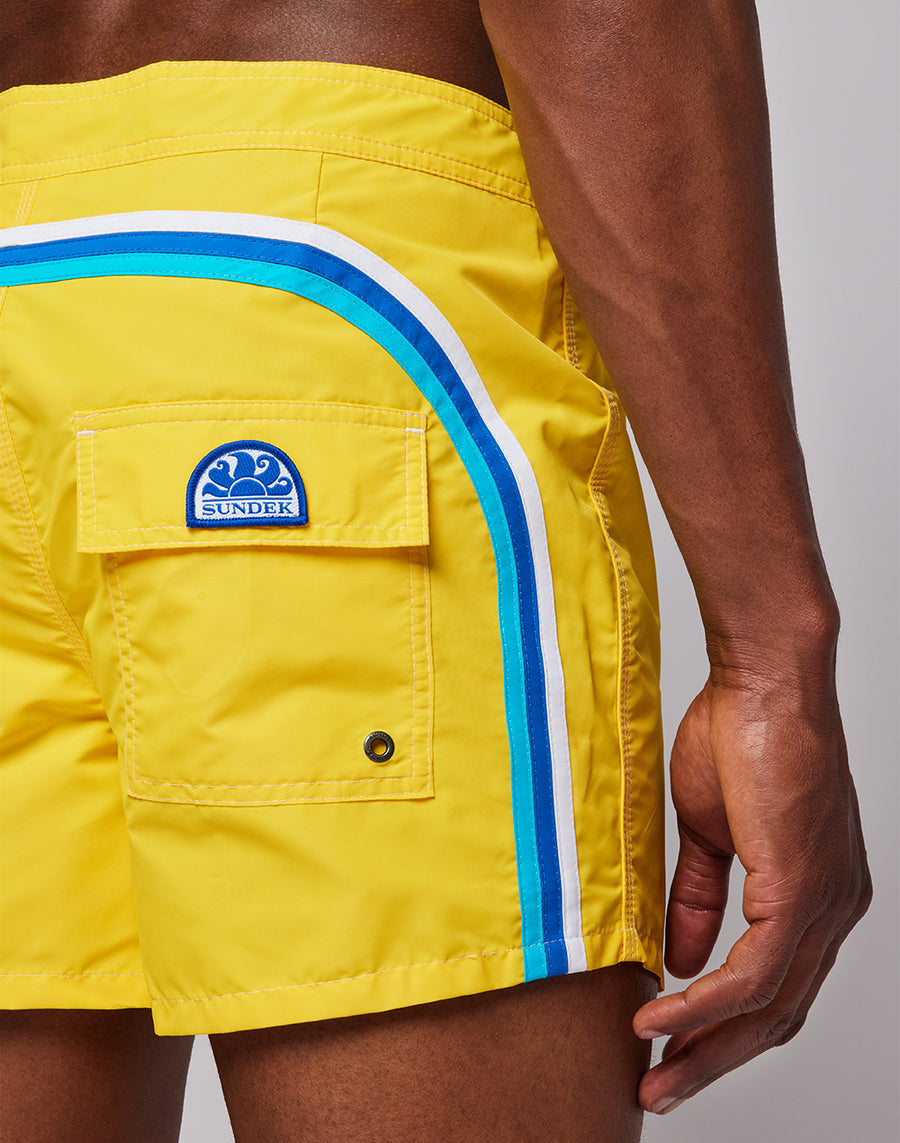 Energia vibrante, colore intenso e l’iconico arcobaleno Sundek che fa capolino per questo costume boxer da uomo. E' realizzato nel nostro tessuto storico nylon taffetà, dalla mano serica confortevole e ad asciugatura rapida, mentre le cuciture a tre aghi lo rendono resistente vacanza dopo vacanza. Lunghezza 35 cm (taglia M), misurati sul lato esterno della gamba.