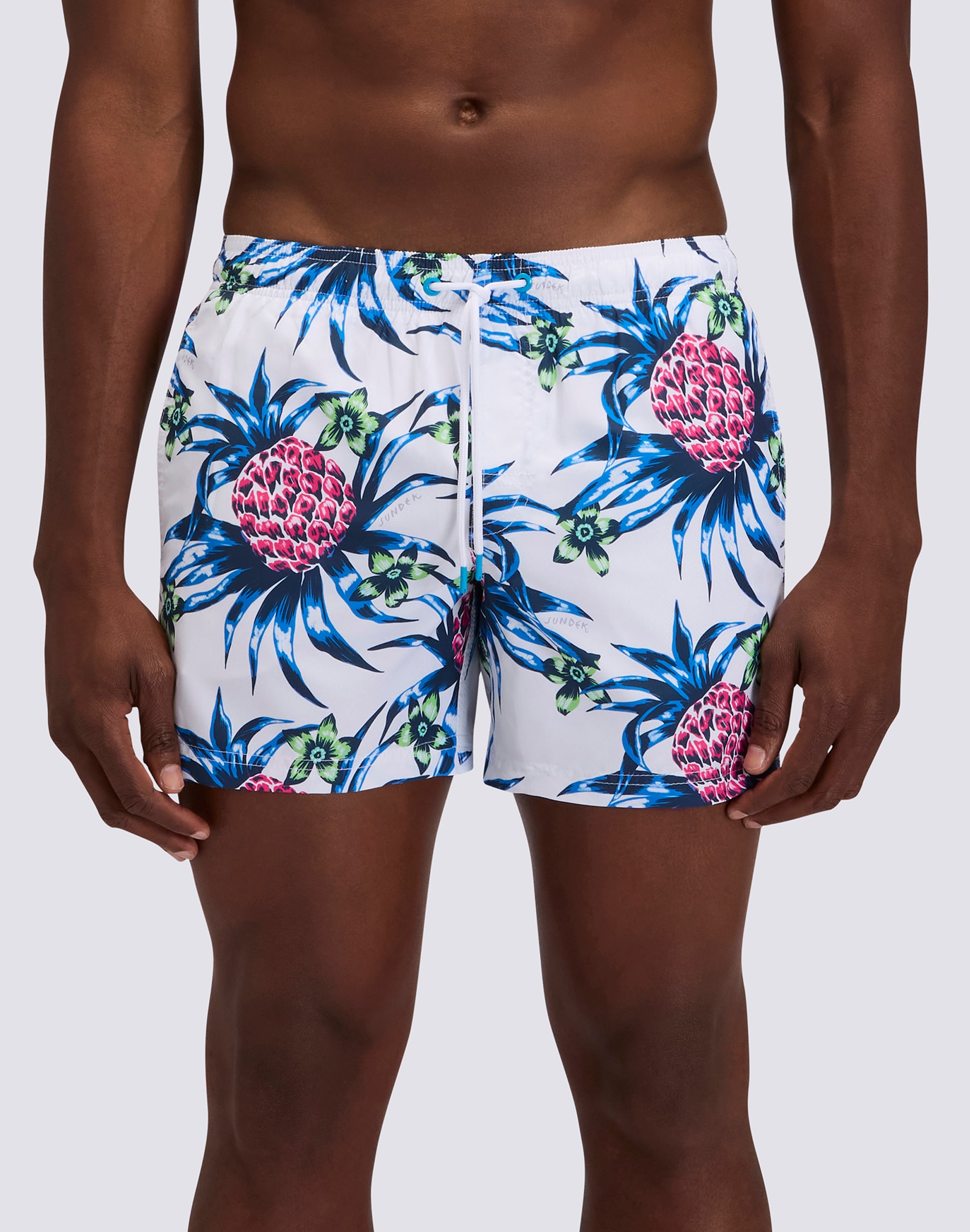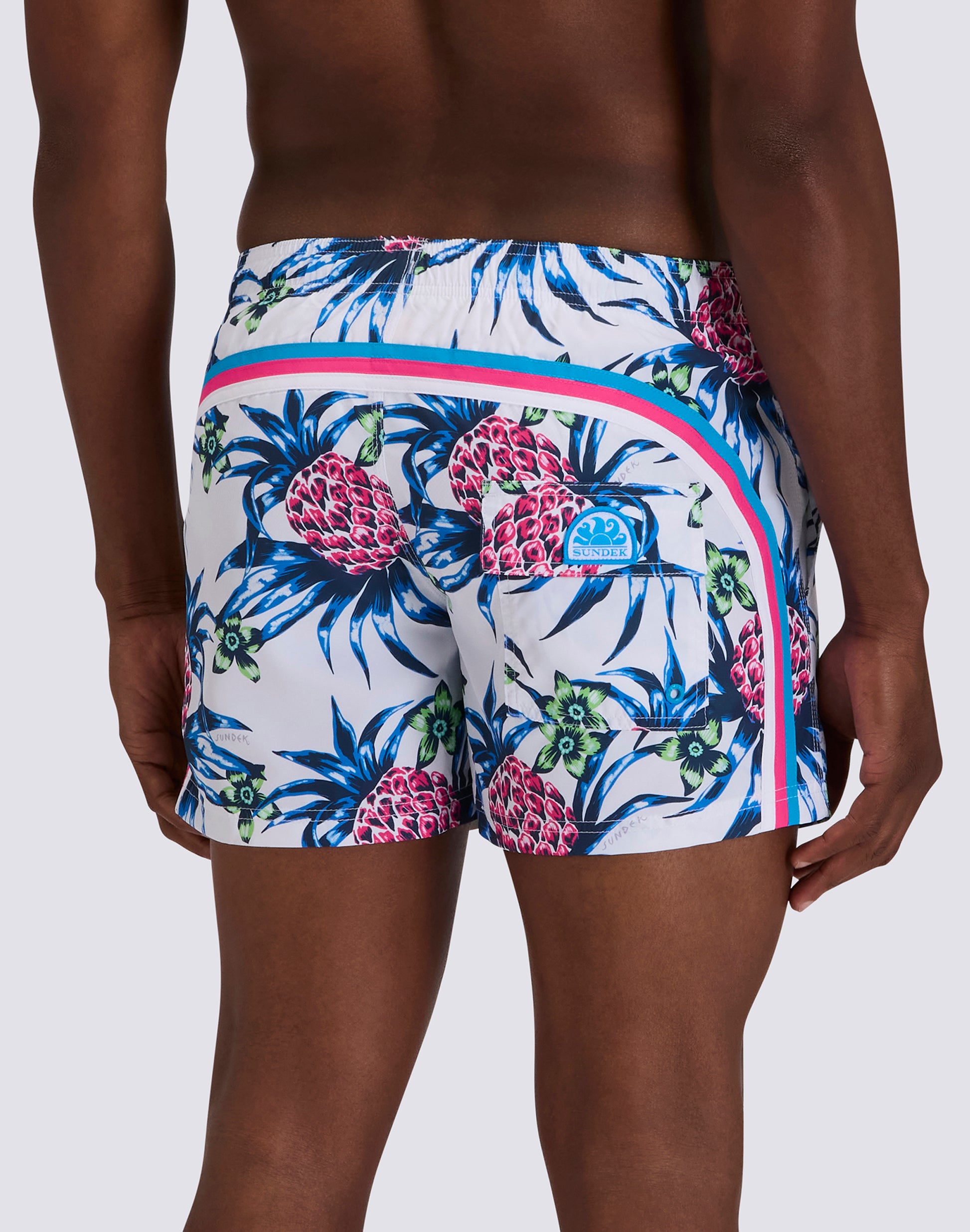 Costume da bagno a pantaloncino da uomo in tessuto riciclato Repreve®, leggero, dall'asciugatura rapida. Dettaglio iconico arcobaleno Sundek sul back e stampa tropicale Tropic Dance. Lunghezza esterno coscia 14”/35 CM (in taglia M).