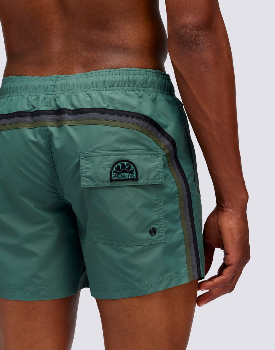 Shorts uomo mare corto e con vita elasticata, coulisse e iconico arcobaleno Sundek sul retro in versione scura. Questo costume è realizzato con cuciture a tre aghi e al 100% con il nostro tessuto storico, il nylon-taffetà: liscio come la seta, leggero e resistente a tutto, si asciuga velocissimo per darti comodità ovunque, tra le onde e fuori dall'acqua. Lunghezza 35 cm (taglia M), misurati sul lato esterno della gamba.