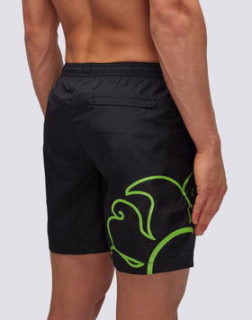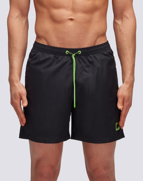 Costume da bagno uomo a pantaloncino lunghezza media a vita elasticata. Dotato di coulisse e tasca posteriore con zip. Si asciuga rapidamente grazie al poliestere leggero con cui è realizzato. Lunghezza esterno gamba 16"/41 cm (in taglia M).