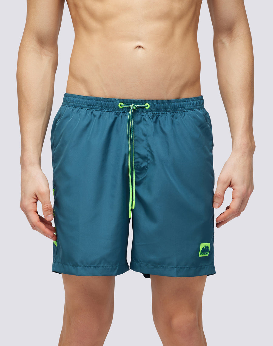 Costume da bagno uomo a pantaloncino lunghezza media a vita elasticata. Dotato di coulisse e tasca posteriore con zip. Si asciuga rapidamente grazie al poliestere leggero con cui è realizzato. Lunghezza esterno gamba 16"/41 cm (in taglia M).