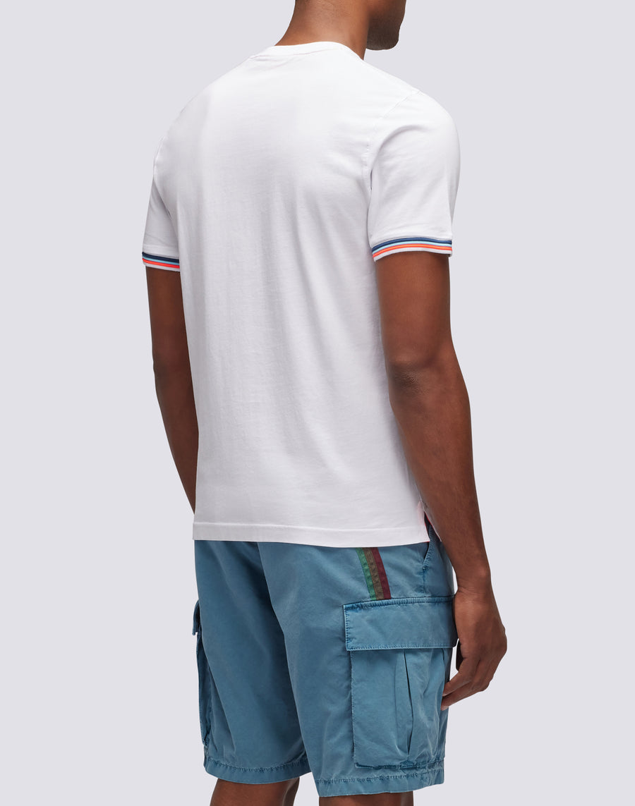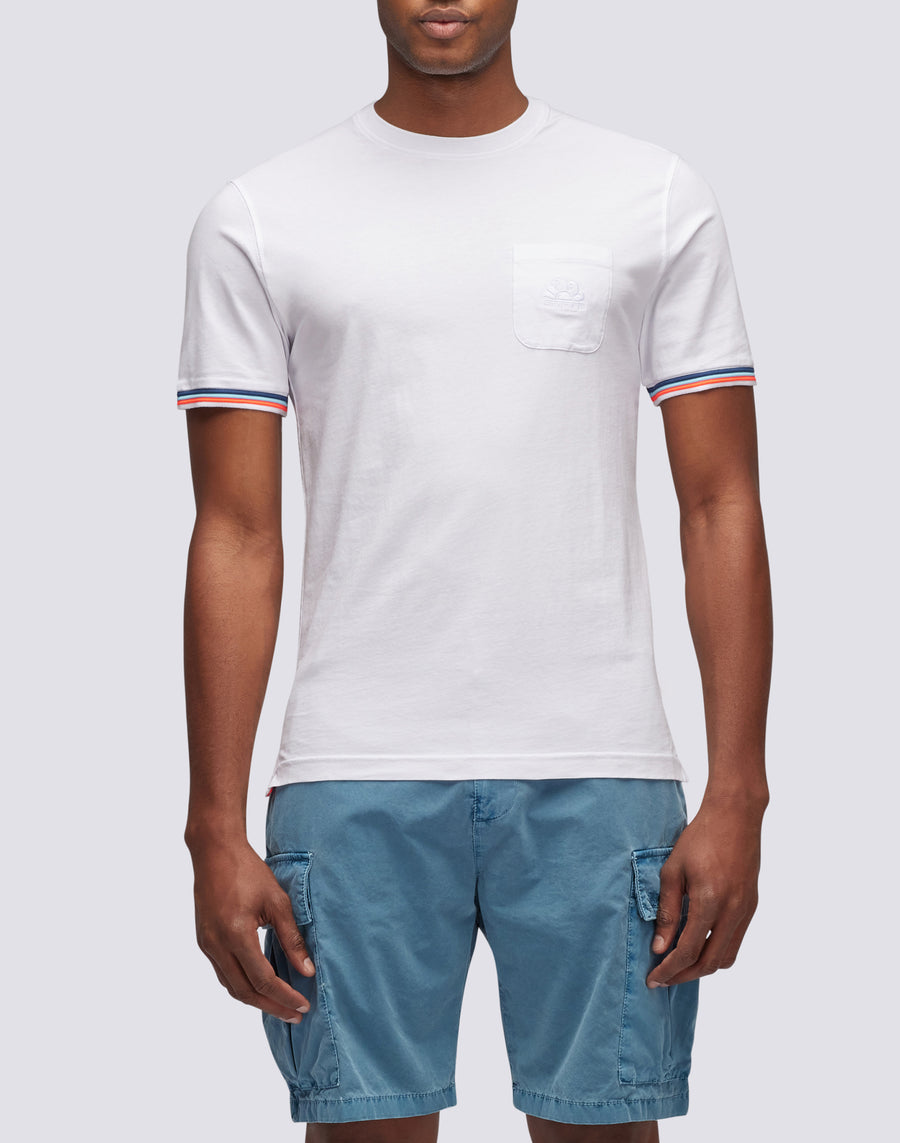 T-shirt sportiva a tinta unita con il particolare tricolor a fondo manica: una scelta di carattere per accompagnare ogni outfit casual Una t-shirt adatta a completare qualsiasi look casual, perfetta in spiaggia con i boardshort e in tutti gli altri momento della giornata con pantaloni lunghi e shorts.