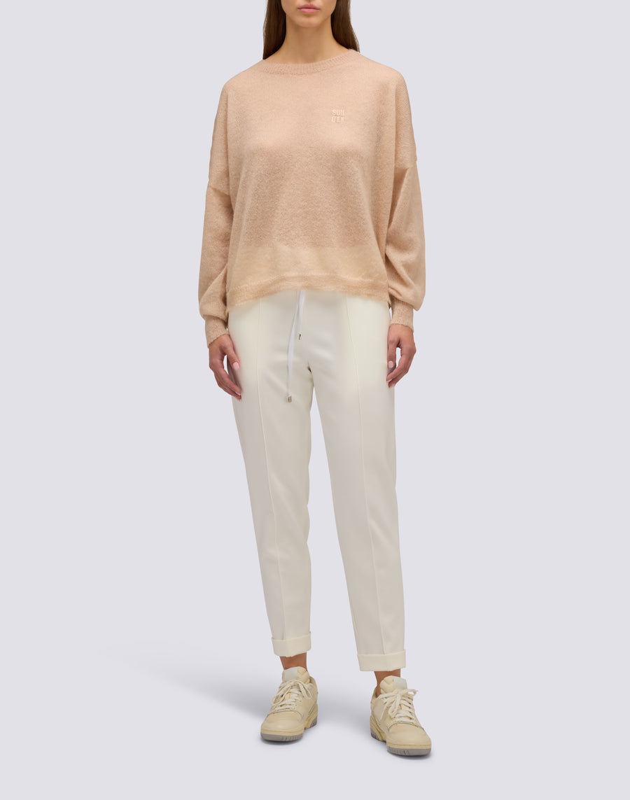 Pantaloni lunghi donna in punto Milano con coulisse regolabile in vita, tasche laterali, piega frontale centrale e orli fissi con risvolto. Fit a sigaretta. Vestibilità slim.