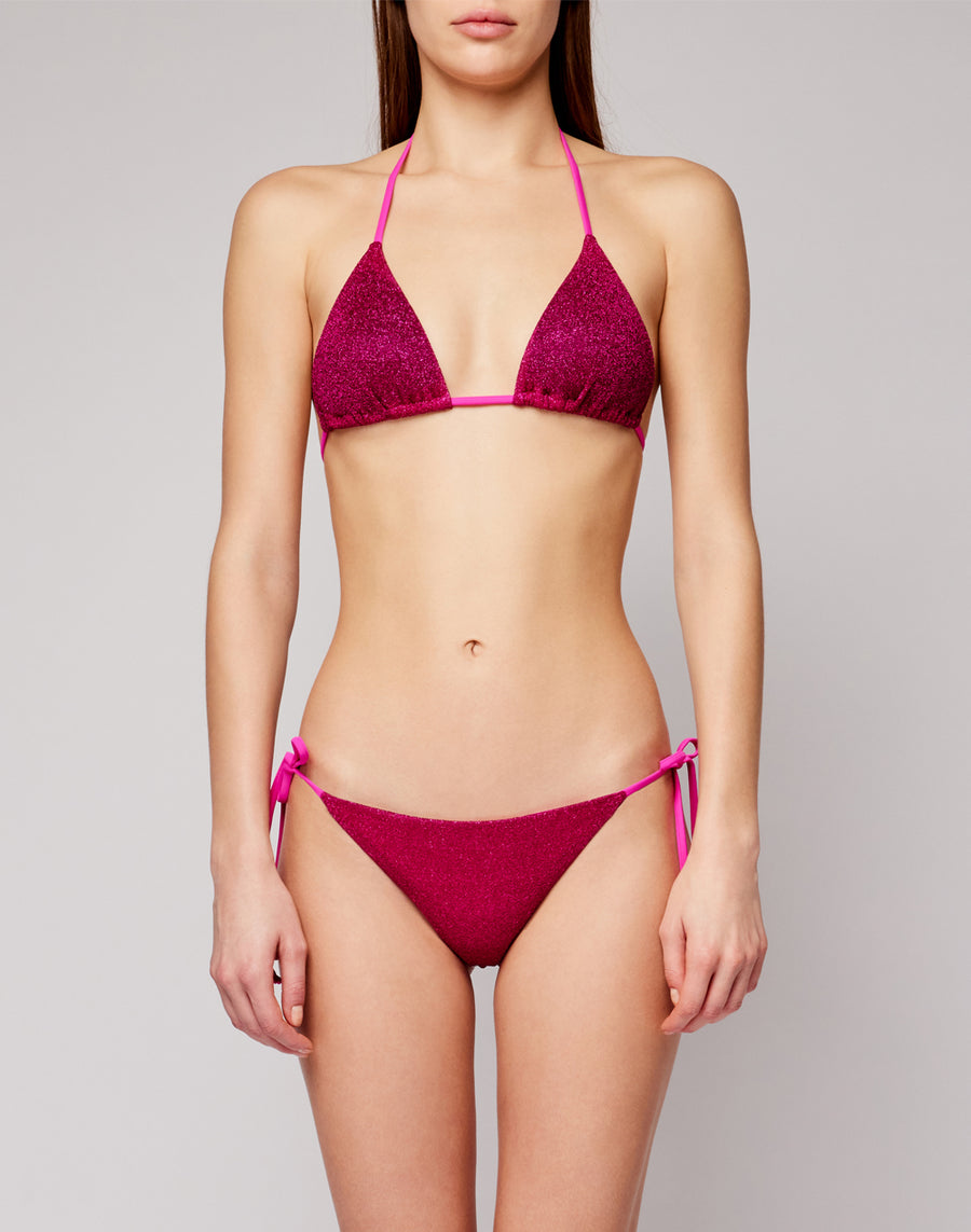 La luminosità del lurex è il dettaglio di questo top a triangolo da abbinare allo slip coordinato per un completo ultra chic. Perfetto anche per i tuoi outfit serali estivi, sotto bluse e top leggeri da quali può rivelarsi in trasparenza.