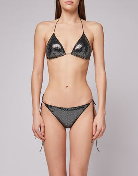Fascino glam per questo top a triangolo rivestito di paillettes che con lo slip in coordinato crea un look beachwear attira sguardi. Sfoggialo anche in altre occasioni sotto bluse e top dai quali può mostrarsi in trasparenza, per un look definito fin nei dettagli.