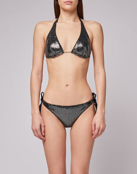 Scegli lo stile di questo bikini top a triangolo americano con paillettes brillanti per un look beachwear dal carattere deciso. Indossalo anche di sera sotto bluse, abiti e canotte dai quali farlo intravedere o abbinalo al mini shorts Lulin in coordinato.
