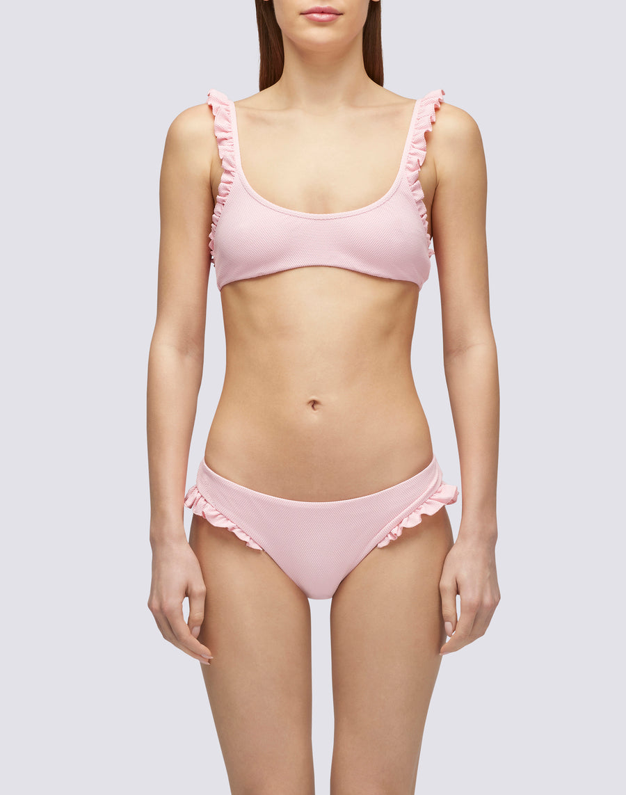 Il top bralette con rouches è un must-have per il tuo guardaroba estivo. Realizzato in morbido tessuto piquet, confortevole e alla moda, questo bikini top aggiungerà un tocco di eleganza ai tuoi look da spiaggia. Da abbinare allo slip coordinato.