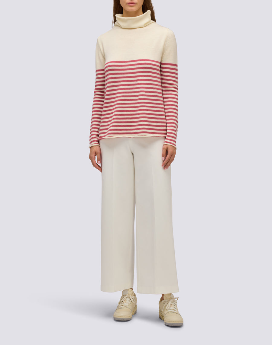 Questo maglione donna in lana merino con collo alto offre calore e stile in ogni occasione. Il dettaglio a righe aggiunge un tocco raffinato e moderno, ideale per valorizzare il tuo look in modo semplice e confortevole.