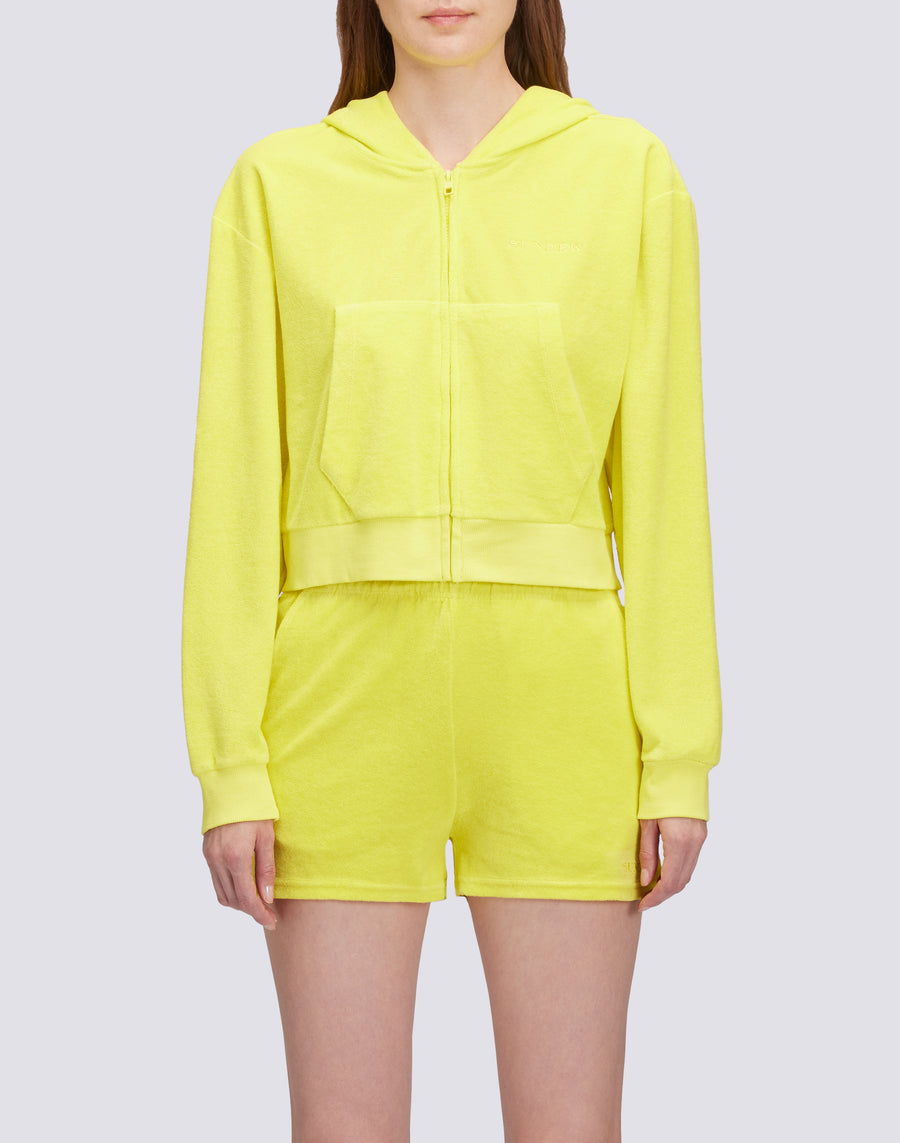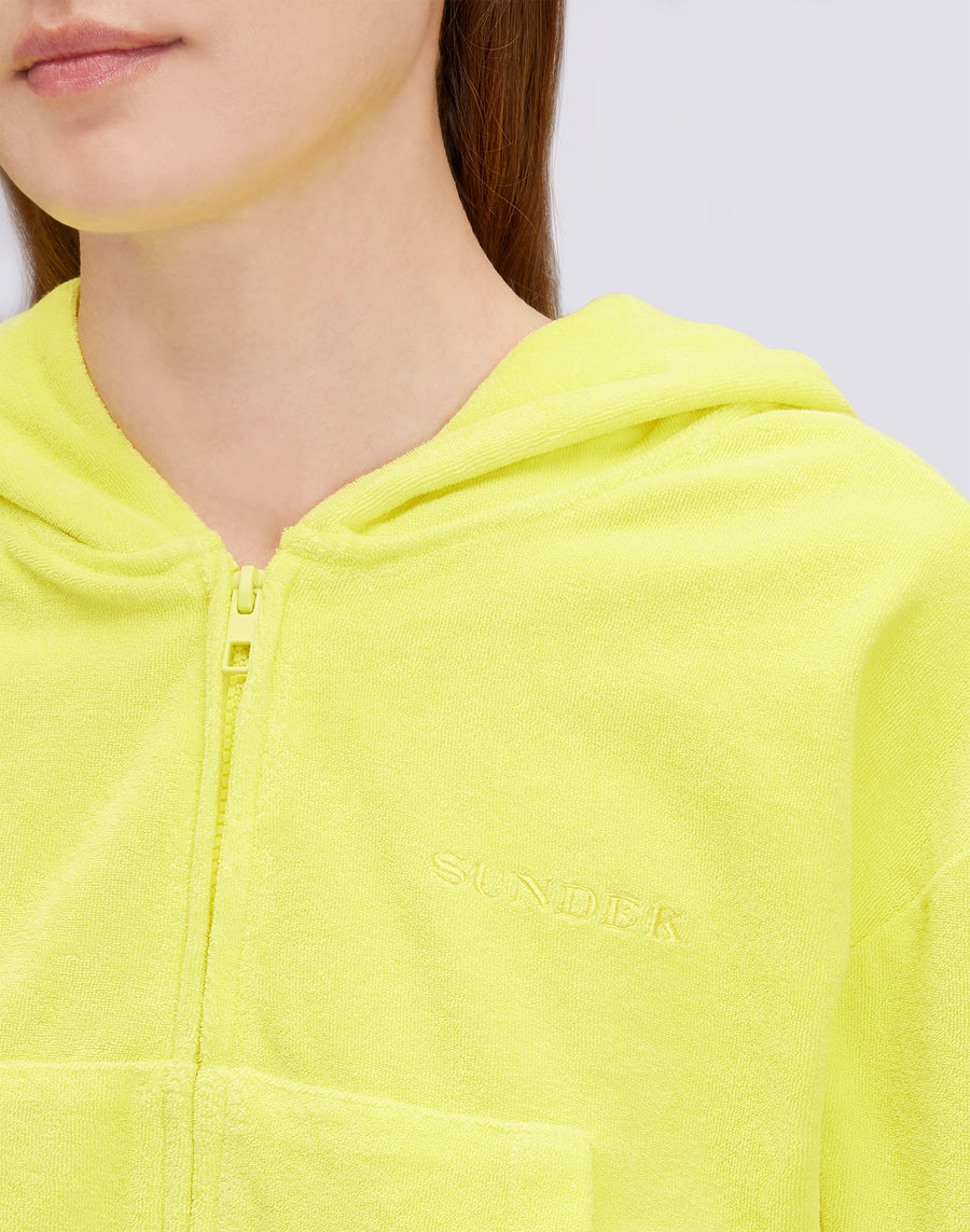 Felpa in spugna elasticizzata con pratica chiusura a zip ed un comodo cappuccio. La sua lavorazione tinto capo ed il ricamo frontale garantiscono uno stile trendy ma allo stesso tempo casual. Da abbinare al suo pantaloncino in coordinato.